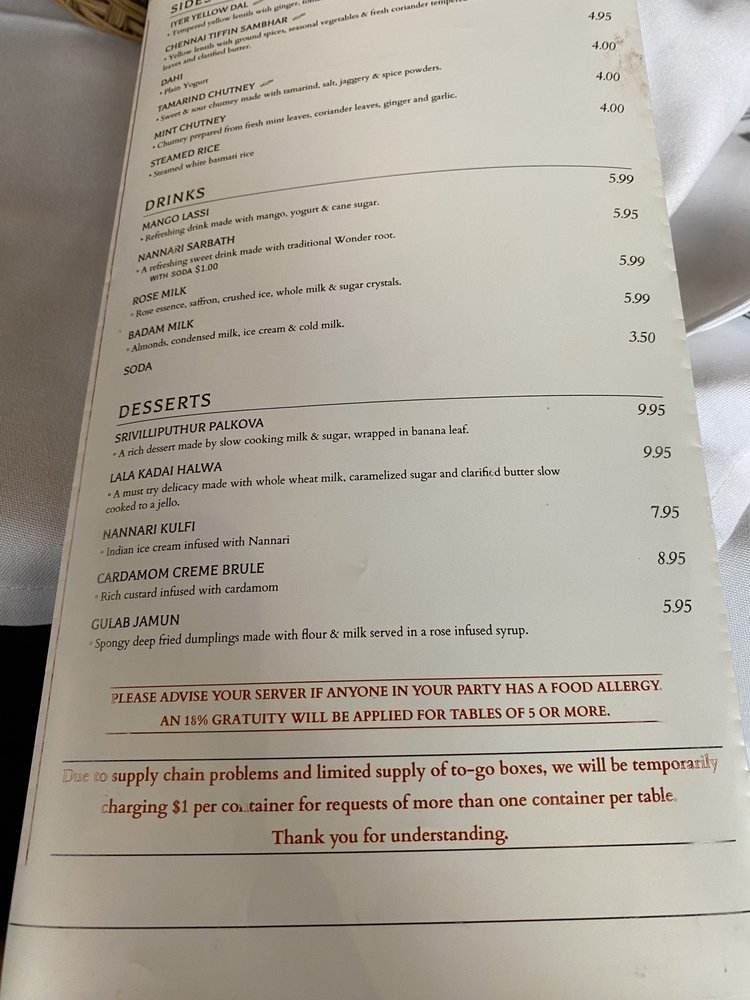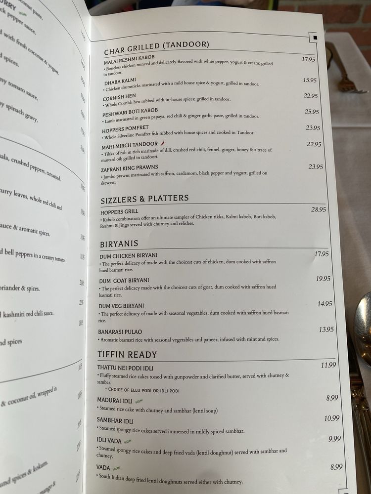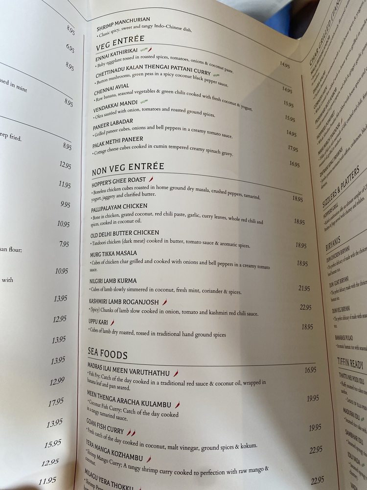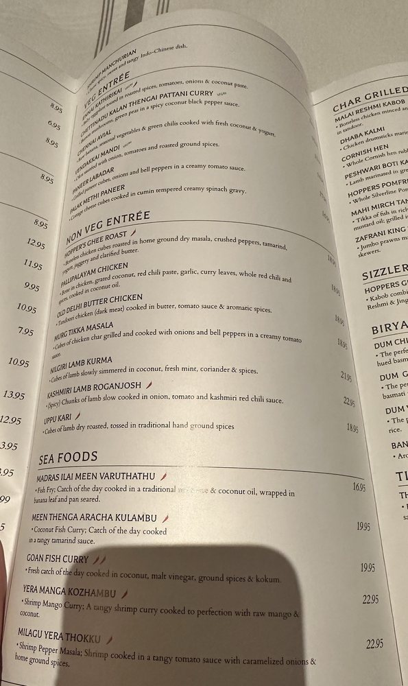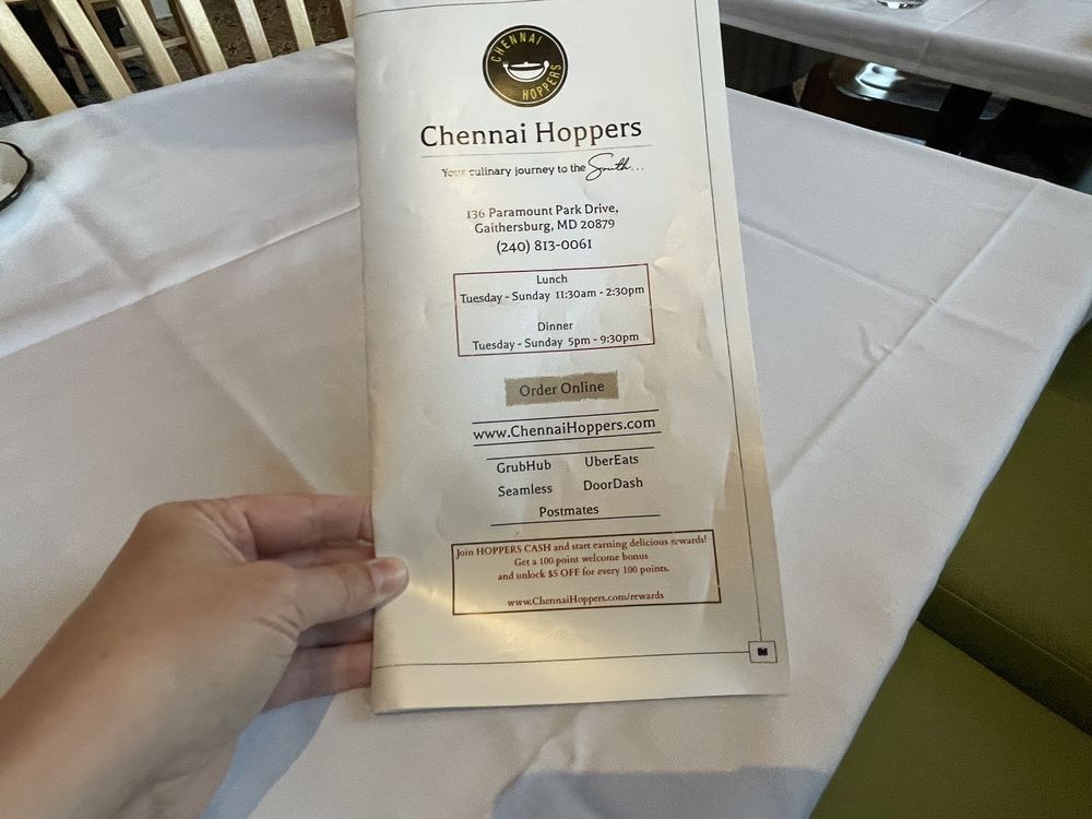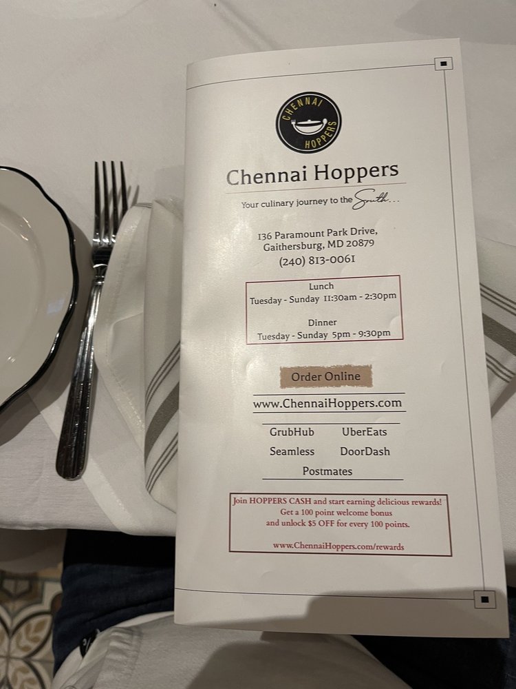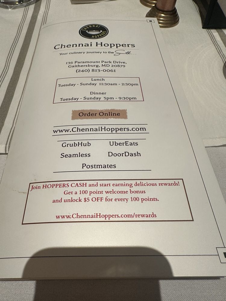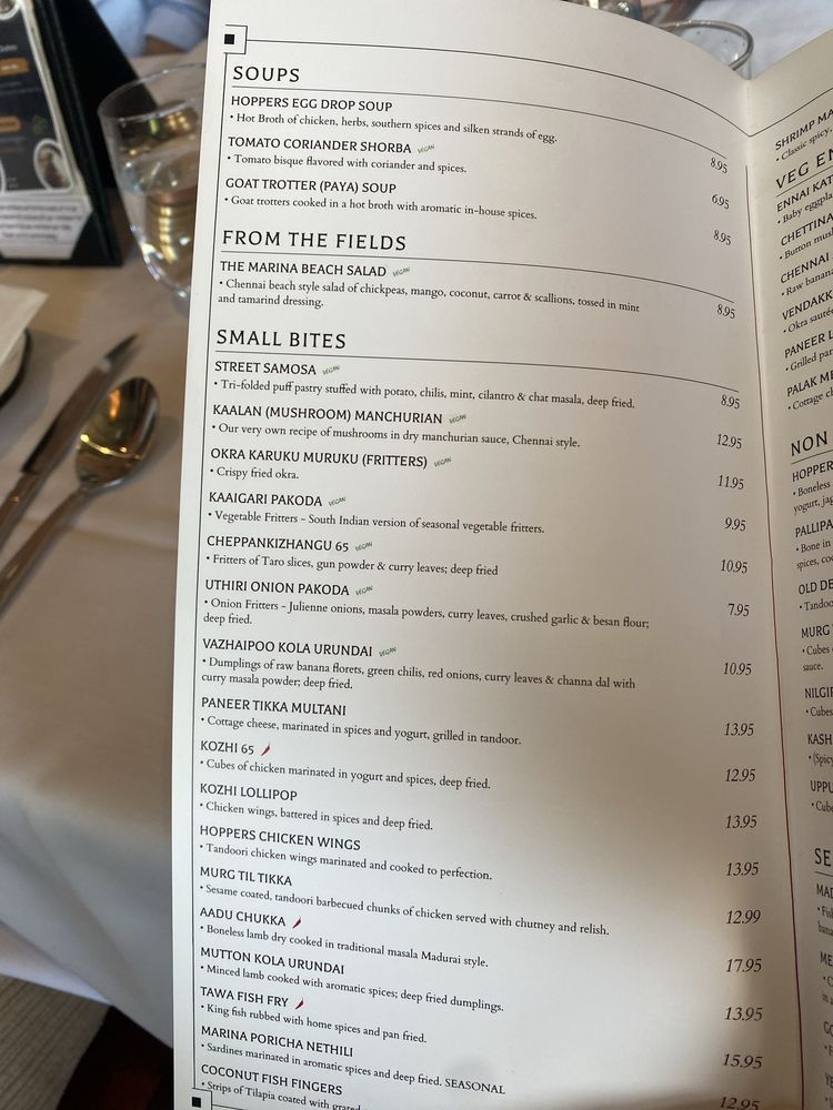 Chennai Hoppers, located in Gaithersburg, MD, offers a unique blend of South and North Indian dishes with a focus on vegan options. The menu features flavorful soups like the Hoppers Egg Drop Soup and Goat Trotter Soup, along with small bites such as the Street Samosa and Chandni Chowk Chaat. Vegetarian options like the Ennai Kathirikai and Chennai Avial showcase the restaurant's commitment to quality and taste. Customers praise the cozy ambiance and friendly staff, making it a great spot for lunch or dinner. With a variety of dishes to choose from, including the popular Kaalan Manchurian and Thattu idli, Chennai Hoppers promises a delightful dining experience for Indian food enthusiasts.